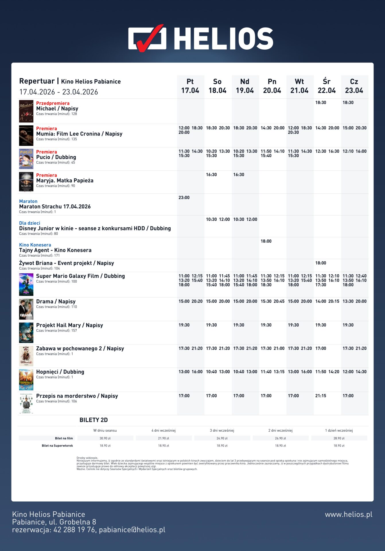 Nowy kinowy tydzień przyniesie moc różnorodnych seansów w sieci Helios! W repertuarze znajdą się premiery dla każdego miłośnika kina: ,,Pucio”, ,,Mumia: Film Lee Cronina” oraz od 22 kwietnia wyczekiwana premiera ,,Michael”. Ponadto na wielkich ekranach pojawią się największe hity ostatnich tygodni oraz seanse specjalne, w tym Maraton Filmowy.