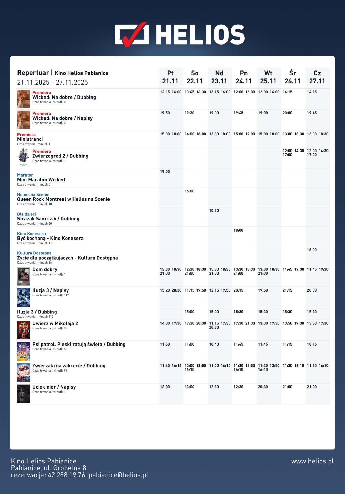 Kino Helios prezentuje najnowsze premiery i nie tylko! W nadchodzącym tygodniu w repertuarze znajdą się aż trzy gorące nowości, wyczekiwane przez wielu kinomanów: „Wicked: Na dobre”, „Ministranci” oraz „Zwierzogród 2”. Ponadto kino oferuje różnorodne tematyczne cykle filmowe i pokazy specjalne, takie jak Mini Maraton „Wicked”.