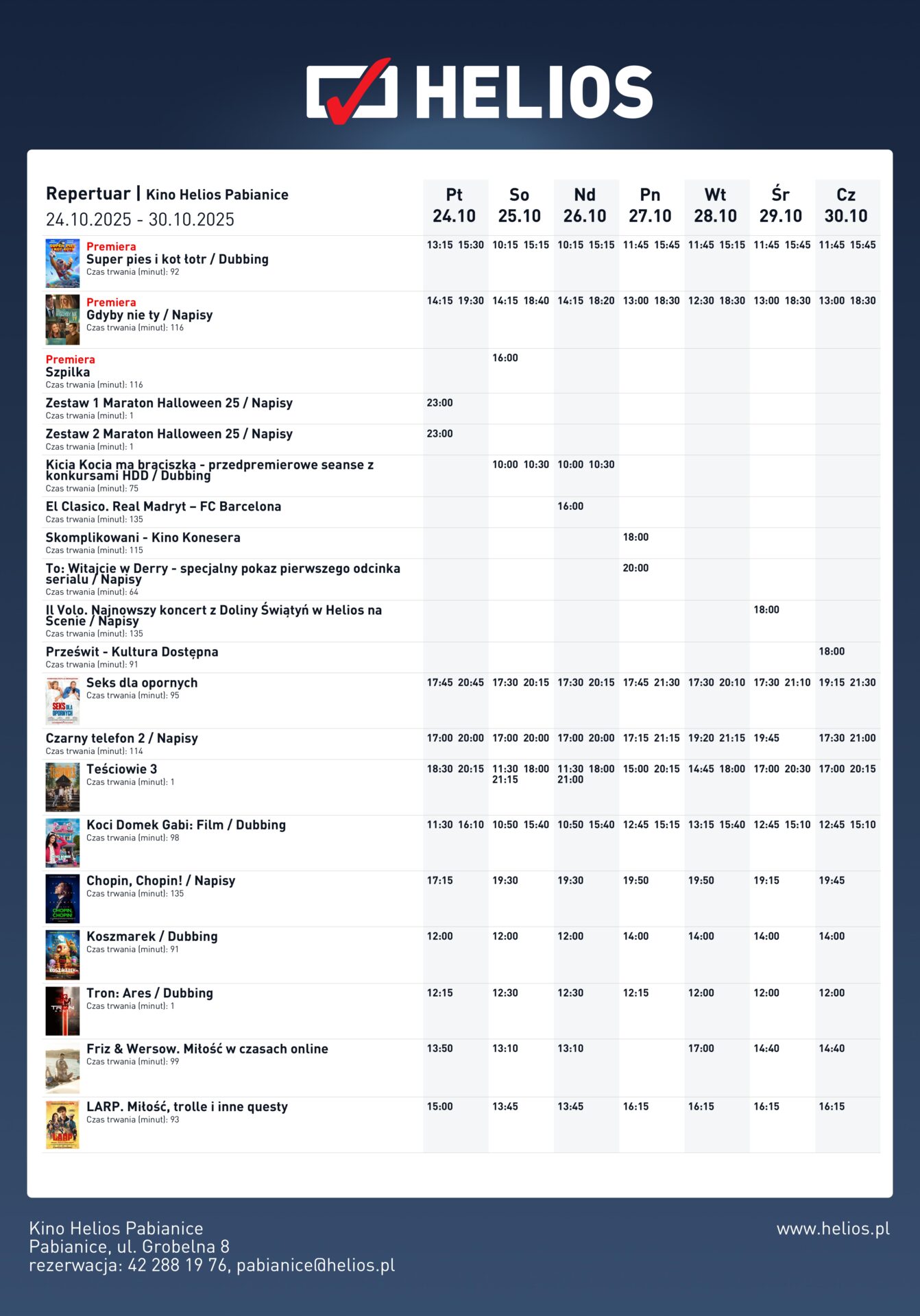Bilety na październikowe seanse dostępne są w kasach kina Helios, w aplikacji mobilnej oraz na stronie www.helios.pl. Dokonując zakupu wcześniej, można wybrać najlepsze miejsca, a także zaoszczędzić w ramach oferty „Wcześniej kupujesz, więcej zyskujesz”.
