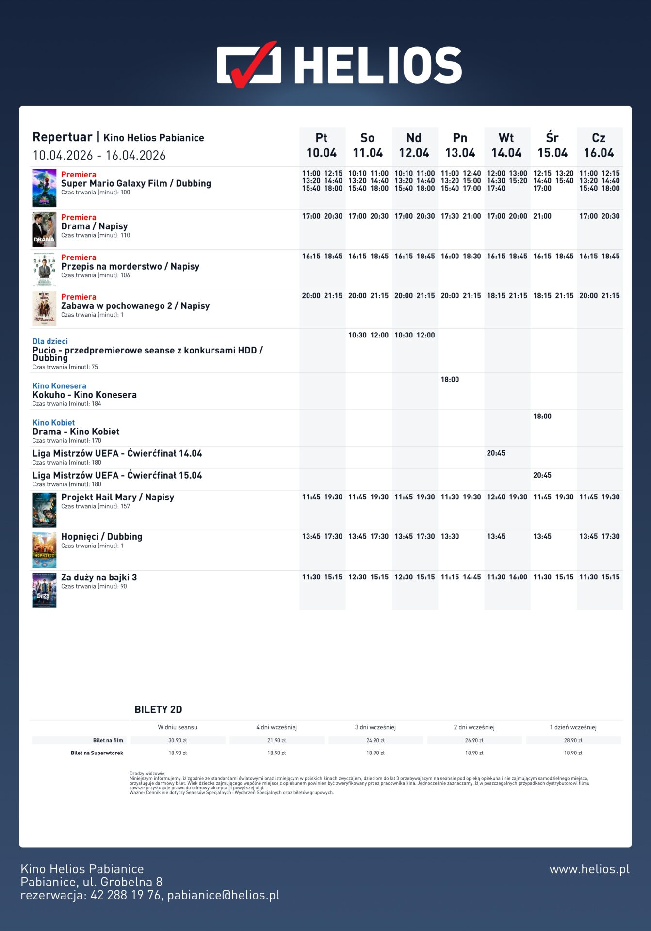 Szczegóły dotyczące aktualnego repertuaru można znaleźć na stronie: www.helios.pl, w aplikacji mobilnej oraz w kasach kinowych sieci w całej Polsce. Dokonując zakupu wcześniej, można wybrać najlepsze miejsca, a także – zaoszczędzić.