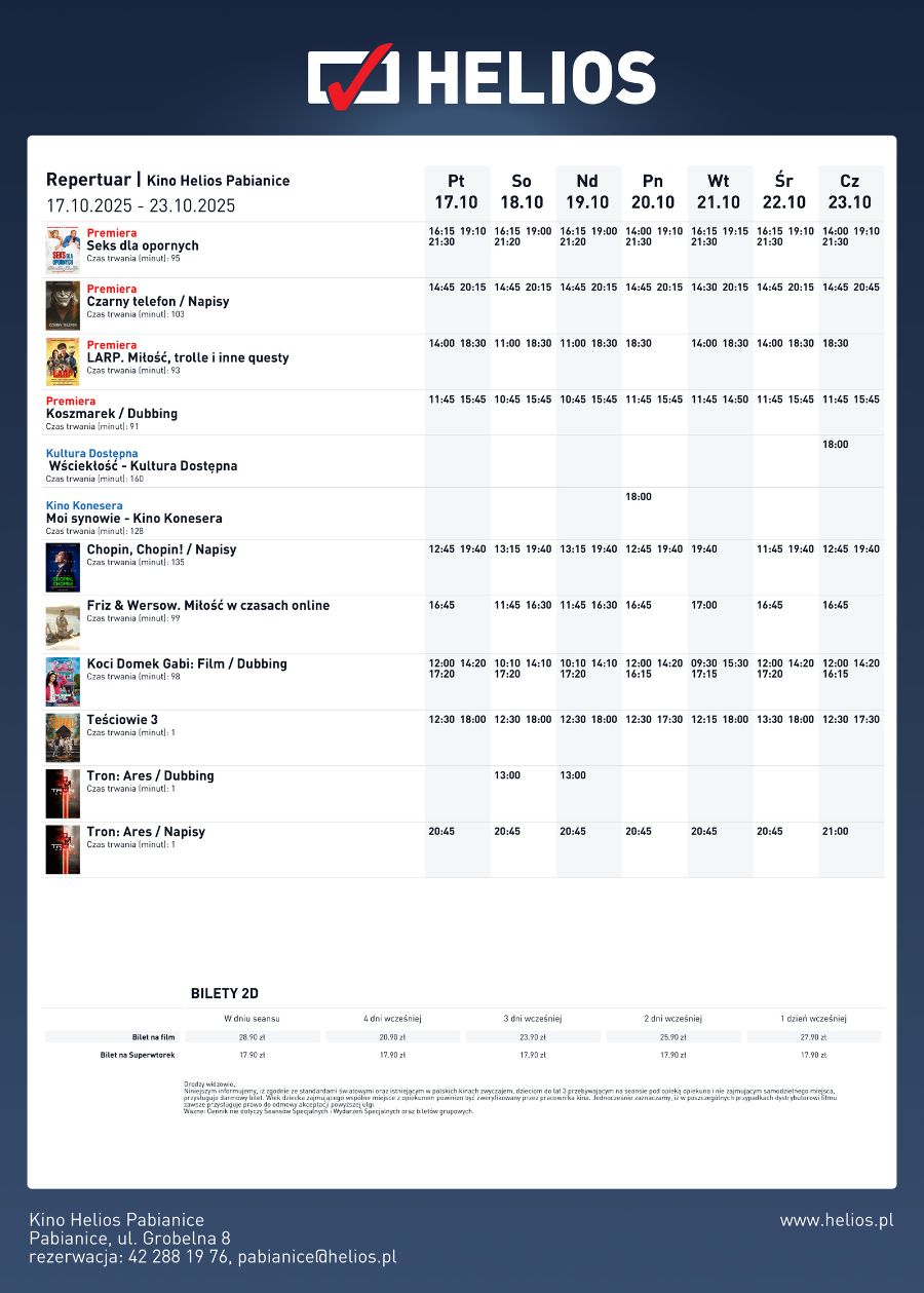 Jesień zachwyca rozmaitymi kolorami, a Helios zachęca kinomanów różnorodnym repertuarem, pełnym filmowych emocji. W nadchodzącym tygodniu na widzów będą czekać dwie premiery: „Seks dla opornych” oraz „Koszmarek”. Na ekranach nie zabraknie także wielkich hitów oraz stałych cykli sieci. Ponadto Helios i serwis streamingowy HBO Max zapraszają na premierowe, bezpłatne pokazy nowego serialu „To: Witajcie w Derry”!