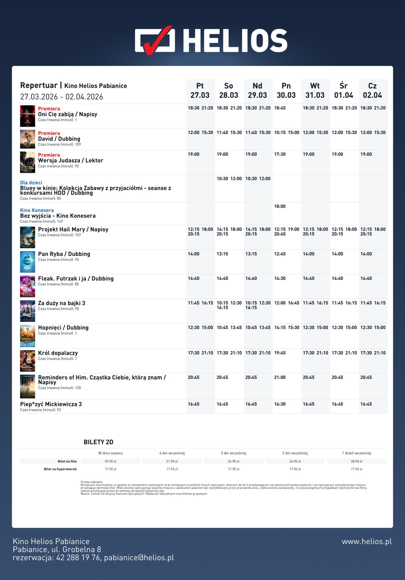 Szczegóły dotyczące aktualnego repertuaru znaleźć na stronie: www.helios.pl, w aplikacji mobilnej oraz w kasach kinowych. Dokonując zakupu wcześniej, można wybrać najlepsze miejsca, a także – zaoszczędzić.